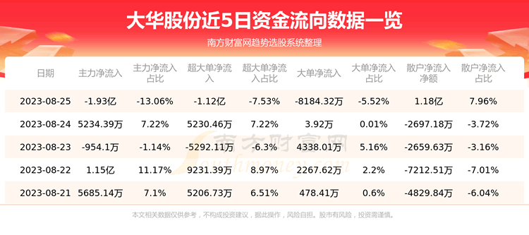 8月25日消息,大华股份8月25日主力资金净流出1.93亿元,超大单资金净流出1.12亿元,大单资金净流出8184.32万元,散户资金净流入1.18亿元。