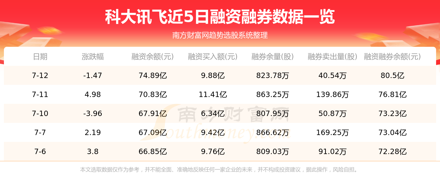 7月12日科大讯飞融券信息显示,融资方面,当日融资买入9.88亿元,融资偿还5.83亿元,融资净买额4.05亿元。融券方面,融券卖出40.54万股,融券偿还80.01万股,融券余量823.78万股,融券余额5.61亿元。融资融券余额80.5亿元。近5日融资融券数据一览见下表: