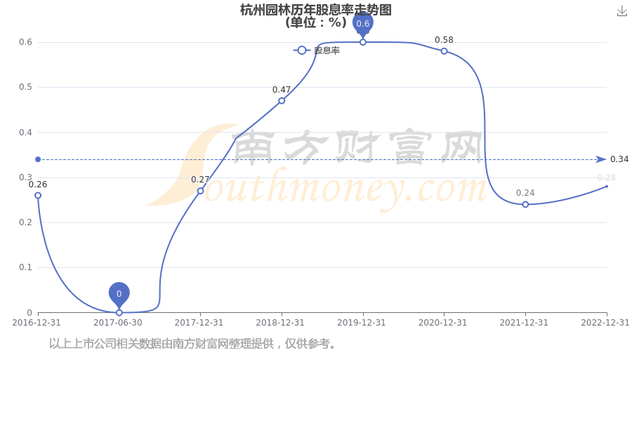 杭州园林最新一次公布的分红方案为10派0.6元。本次权益分派股权登记日为2023年5月30日,除权除息日为2023年5月31日,派息日为2023年5月31日。