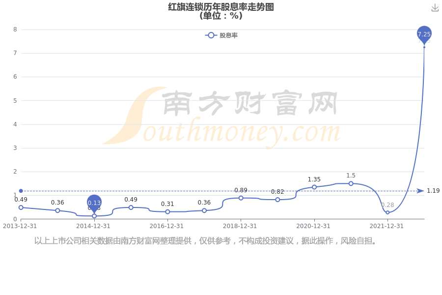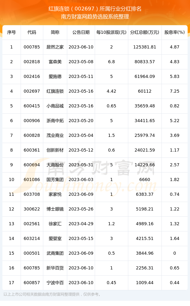 按照趋势选股系统统计,红旗连锁所属行业为商业百货行业,商业百货行业分红排名情况如下表: