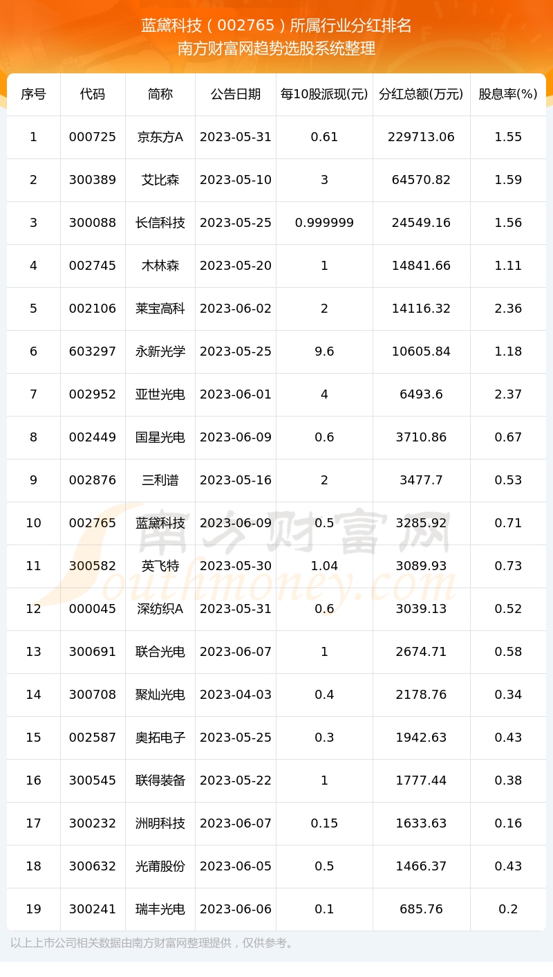 按照趋势选股系统统计,蓝黛科技所属行业为光学光电子行业,光学光电子行业分红排名情况如下表: