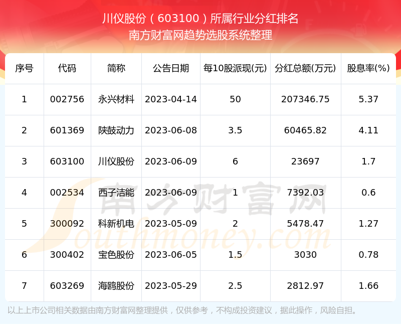 按照趋势选股系统统计,川仪股份所属行业为仪器仪表行业,仪器仪表行业分红排名情况如下表: