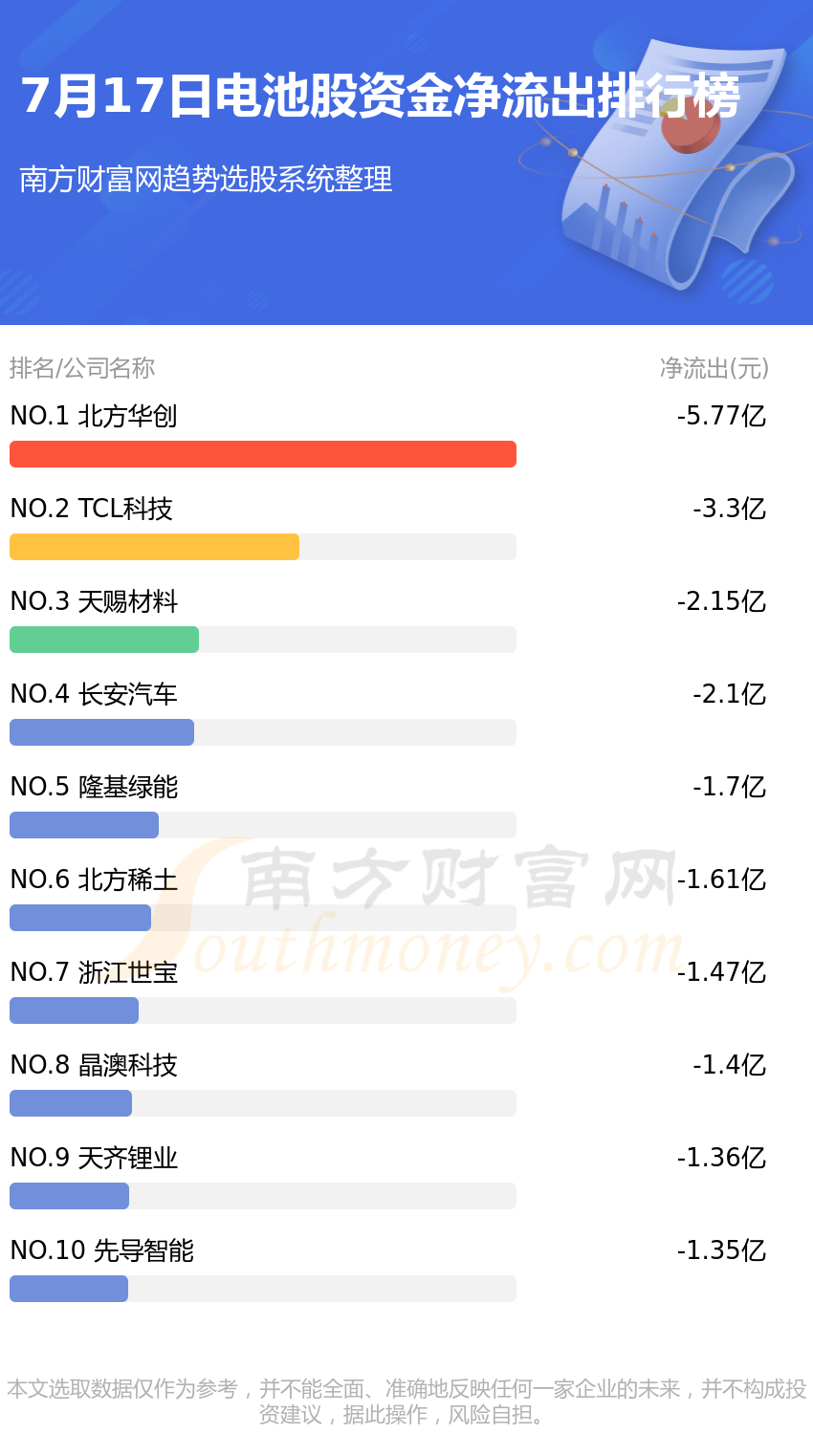 电池股7月17日资金净流出情况来看,北方华创位列第一位,主力净流出达到-5.77亿元;TCL科技排名第二,主力净流出为-3.3亿元;天赐材料排名第三,主力净流出-2.15亿元。主力净流出排名前10的还有:长安汽车、隆基绿能、北方稀土、浙江世宝、晶澳科技、天齐锂业、先导智能。