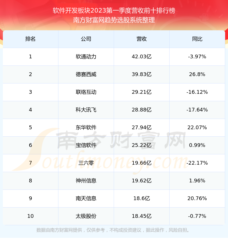 按照趋势选股系统统计,该股所属板块为软件开发板块,该板块共有187只股票,中科软2023第一季度营收在该板块中排名为第16名,该板块2023第一季度营收排名前十的股票如下表: