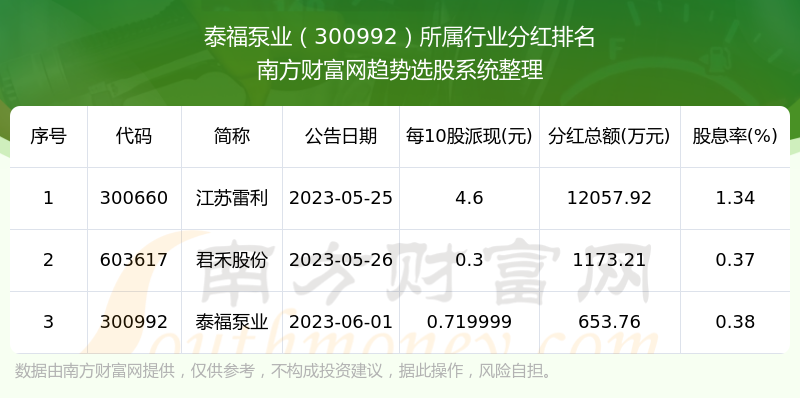 按照趋势选股系统统计,泰福泵业所属行业为泵行业,泵行业分红排名情况如下表: