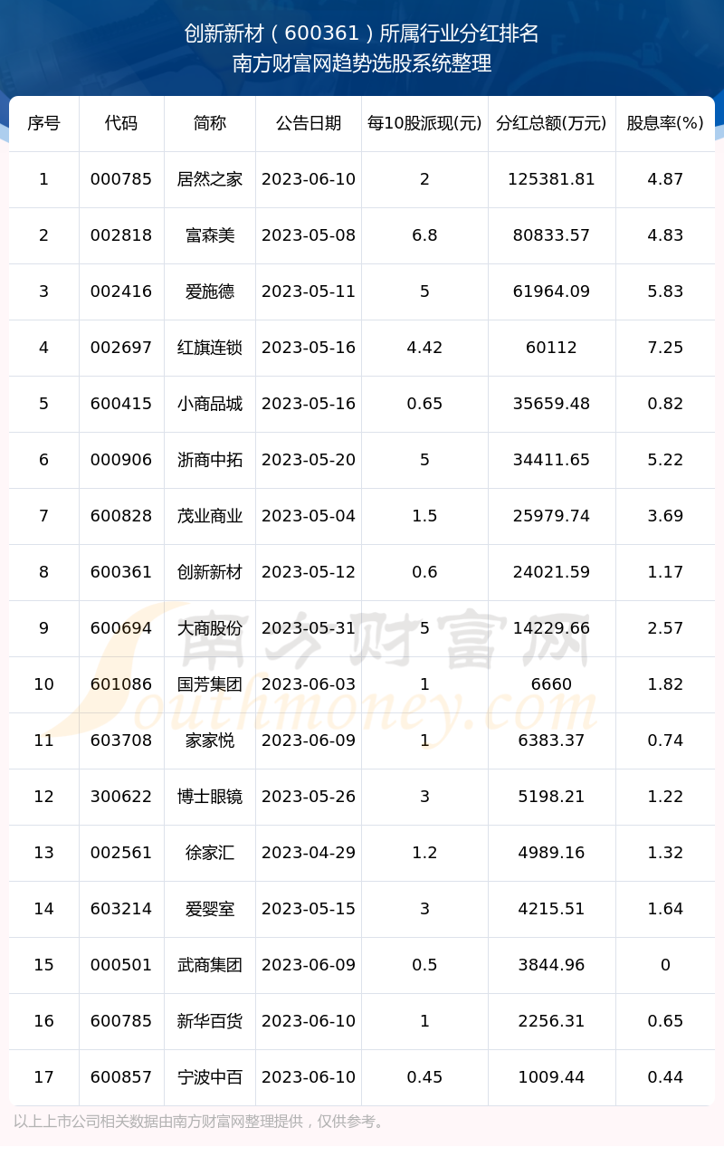 按照趋势选股系统统计,创新新材所属行业为商业百货行业,商业百货行业分红排名情况如下表: