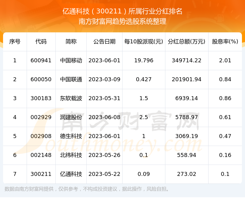 按照趋势选股系统统计,亿通科技所属行业为通信服务行业,通信服务行业分红排名情况如下表: