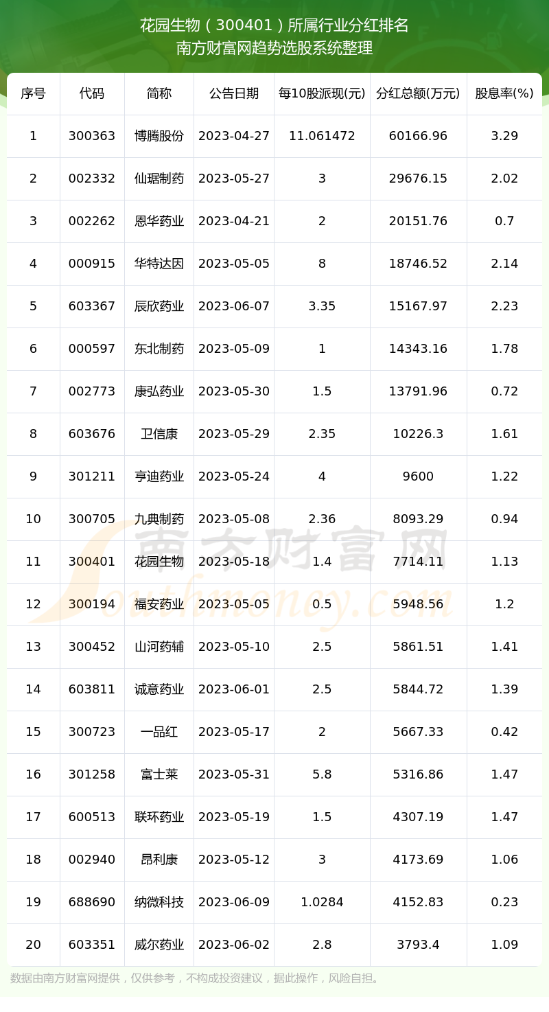 二、花园生物300401行业分红排名