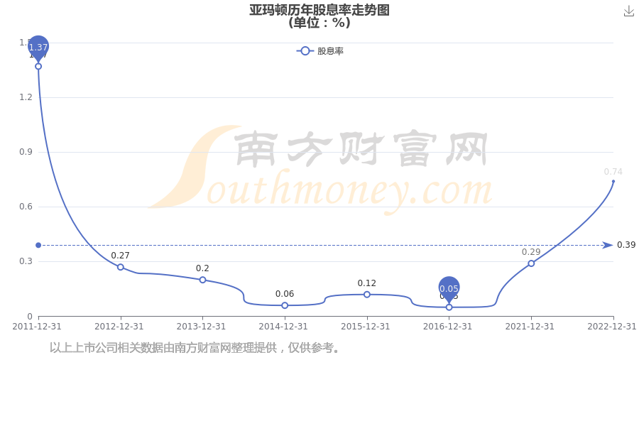 近年亚玛顿年度股息率走势如下图: