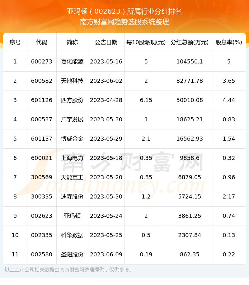 二、亚玛顿002623行业分红排名