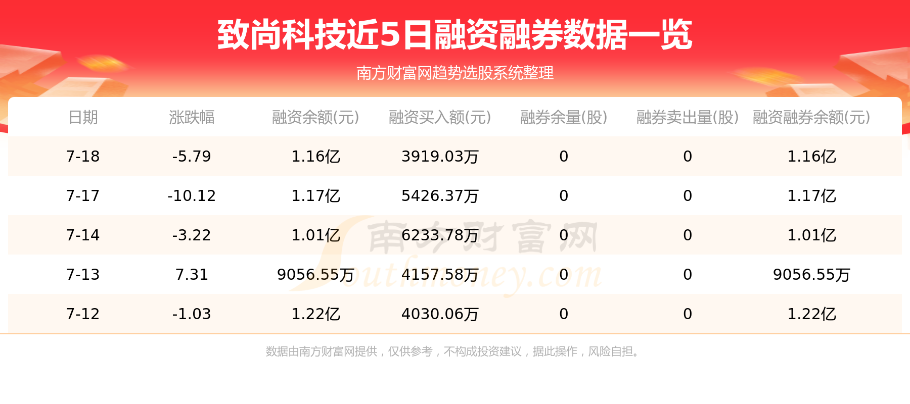 致尚科技7月18日融券信息显示,融资方面,当日融资买入3919.03万元,融资偿还3943.86万元,融资净买额-24.84万元。近5日融资融券数据一览见下表:
