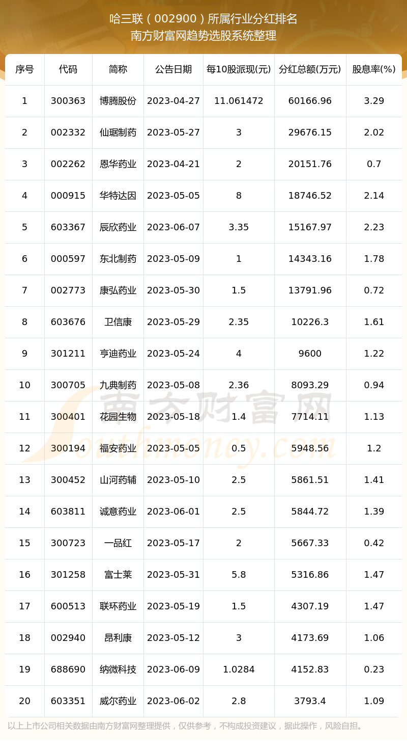 按照趋势选股系统统计,哈三联所属行业为冻干粉针剂行业,冻干粉针剂行业分红排名情况如下表: