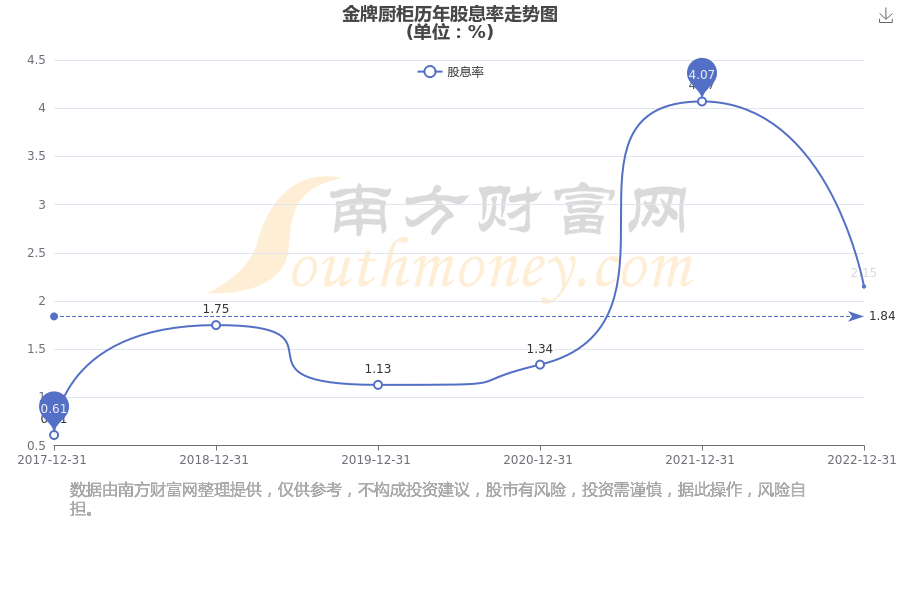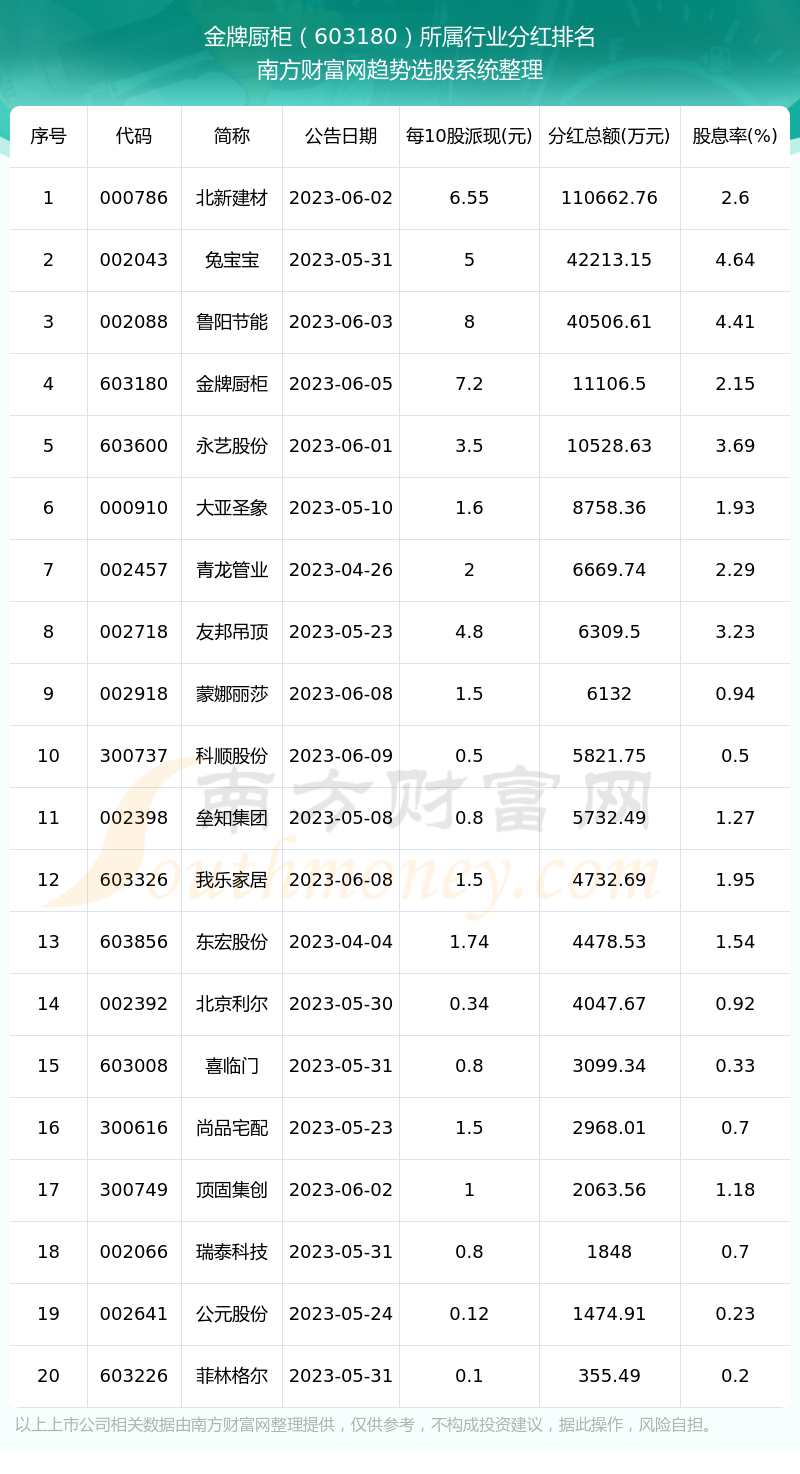 按照趋势选股系统统计,金牌厨柜所属行业为厨柜行业,厨柜行业分红排名情况如下表: