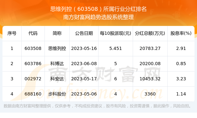 按照趋势选股系统统计,思维列控所属行业为控制系统行业,控制系统行业分红排名情况如下表: