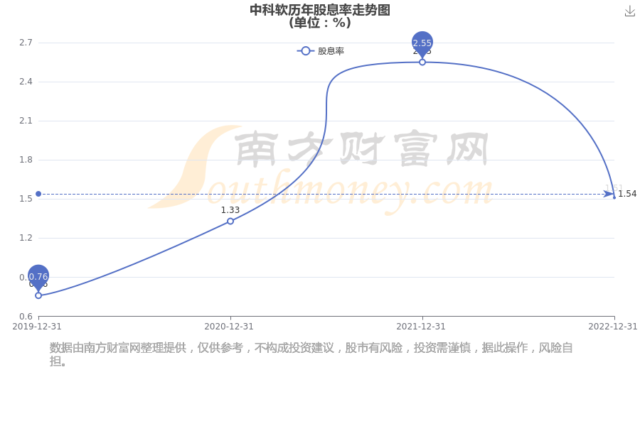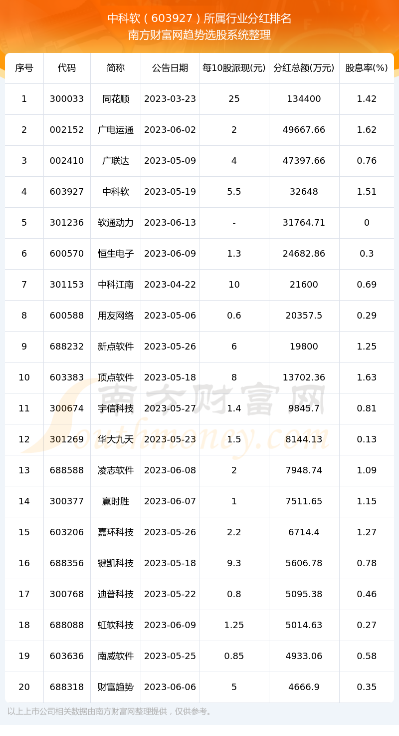 按照趋势选股系统统计,中科软所属行业为软件开发行业,软件开发行业分红排名情况如下表: