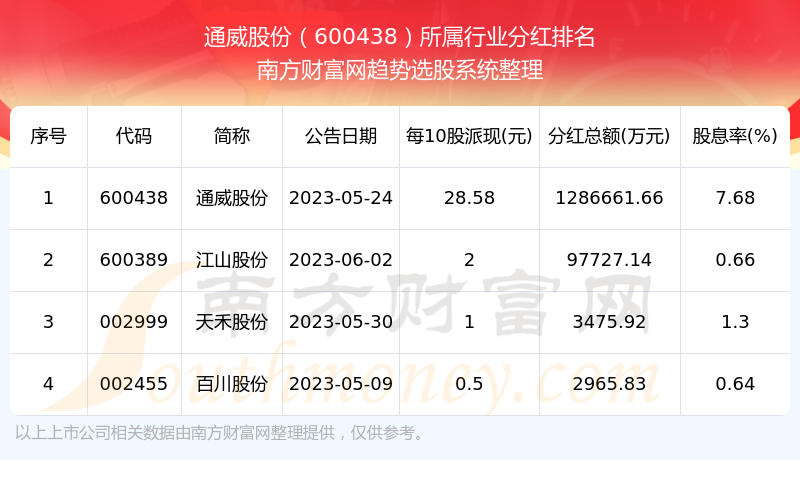 按照趋势选股系统统计,通威股份所属行业为太阳能电池行业,太阳能电池行业分红排名情况如下表: