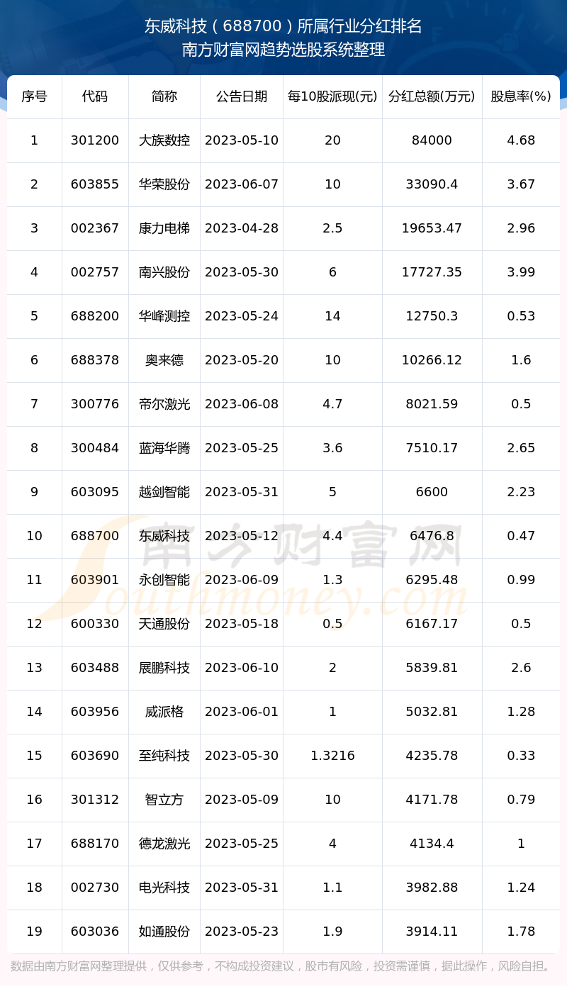 按照趋势选股系统统计,东威科技所属行业为专用设备行业,专用设备行业分红排名情况如下表:
