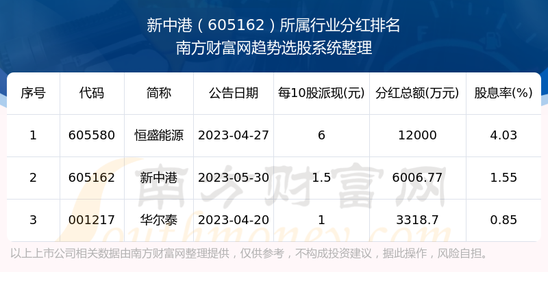 按照趋势选股系统统计,新中港所属行业为蒸汽行业,蒸汽行业分红排名情况如下表:
