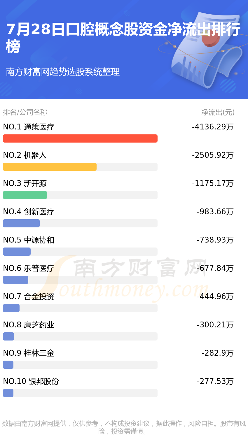 口腔概念股7月28日资金净流出情况来看,通策医疗位列第一位,主力净流出达到-4136.29万元;机器人排名第二,主力净流出为-2505.92万元;新开源排名第三,主力净流出-1175.17万元。主力净流出排名前10的还有:创新医疗、中源协和、乐普医疗、合金投资、康芝药业、桂林三金、银邦股份。