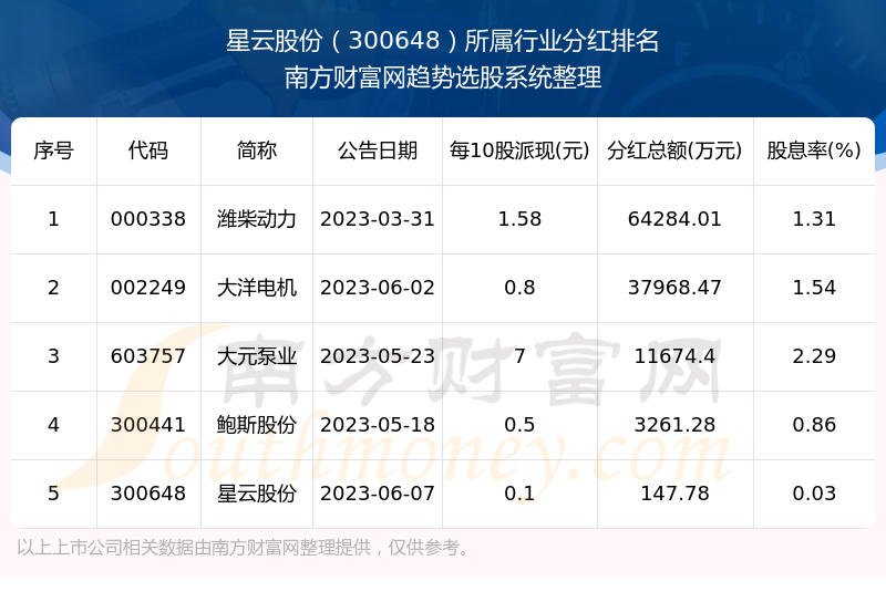 按照趋势选股系统统计,星云股份所属行业为锂电池设备行业,锂电池设备行业分红排名情况如下表: