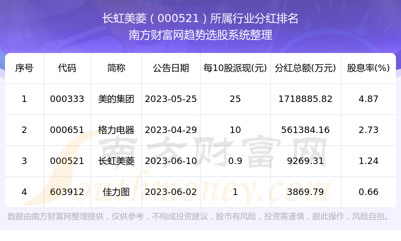 按照趋势选股系统统计,长虹美菱所属行业为空调行业,空调行业分红排名情况如下表: