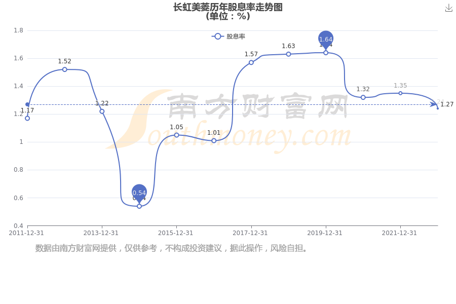 长虹美菱最新一次公布的分红方案为10派0.9元。本次权益分派股权登记日为2023年6月15日,除权除息日为2023年6月16日,派息日为2023年6月16日。