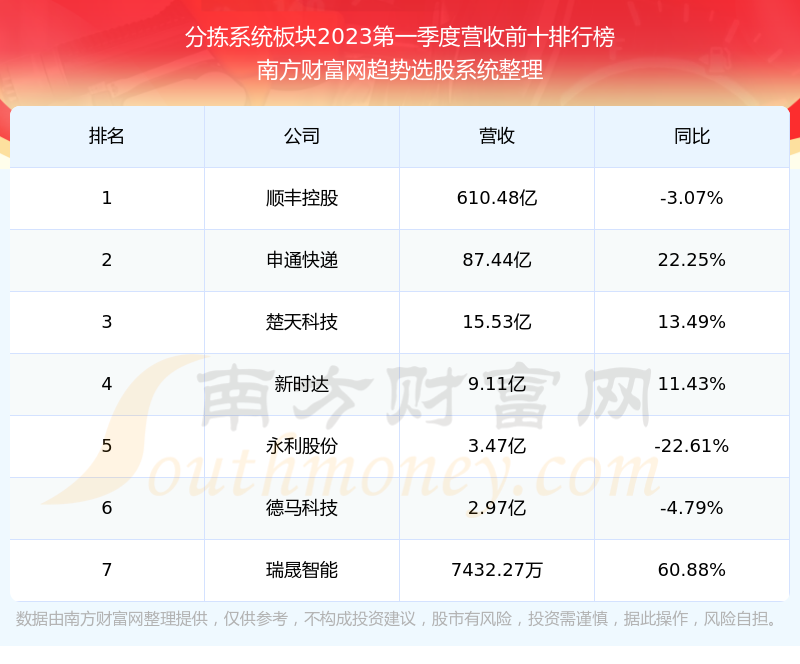 按照趋势选股系统统计,该股所属板块为分拣系统板块,该板块共有7只股票,科捷智能2023第一季度营收在该板块中排名为第7名,该板块2023第一季度营收排名前十的股票如下表:
