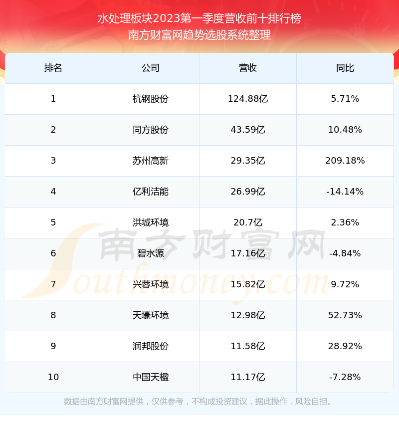 按照趋势选股系统统计,该股所属板块为水处理板块,该板块共有46只股票,金科环境2023第一季度营收在该板块中排名为第38名,该板块2023第一季度营收排名前十的股票如下表: