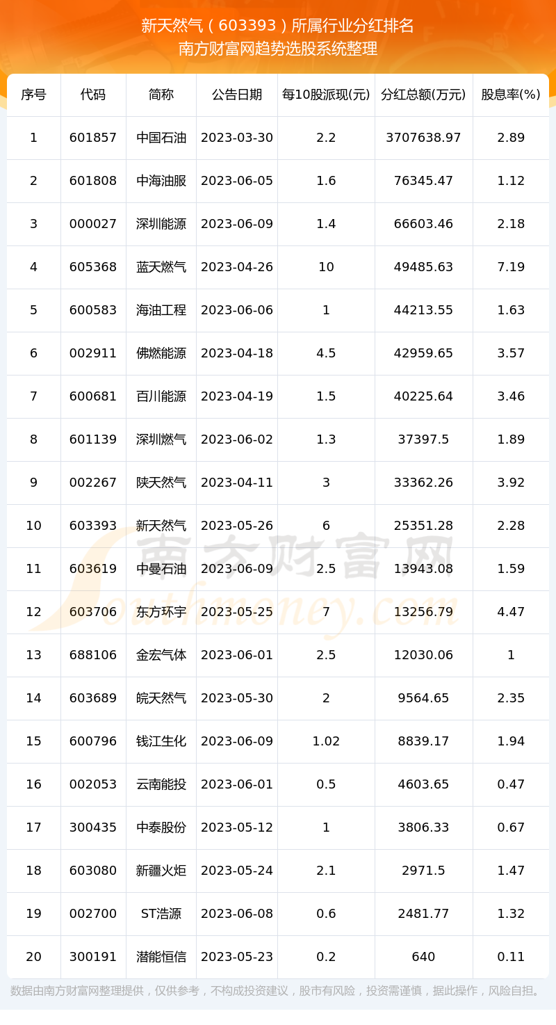 按照趋势选股系统统计,新天然气所属行业为天然气行业,天然气行业分红排名情况如下表: