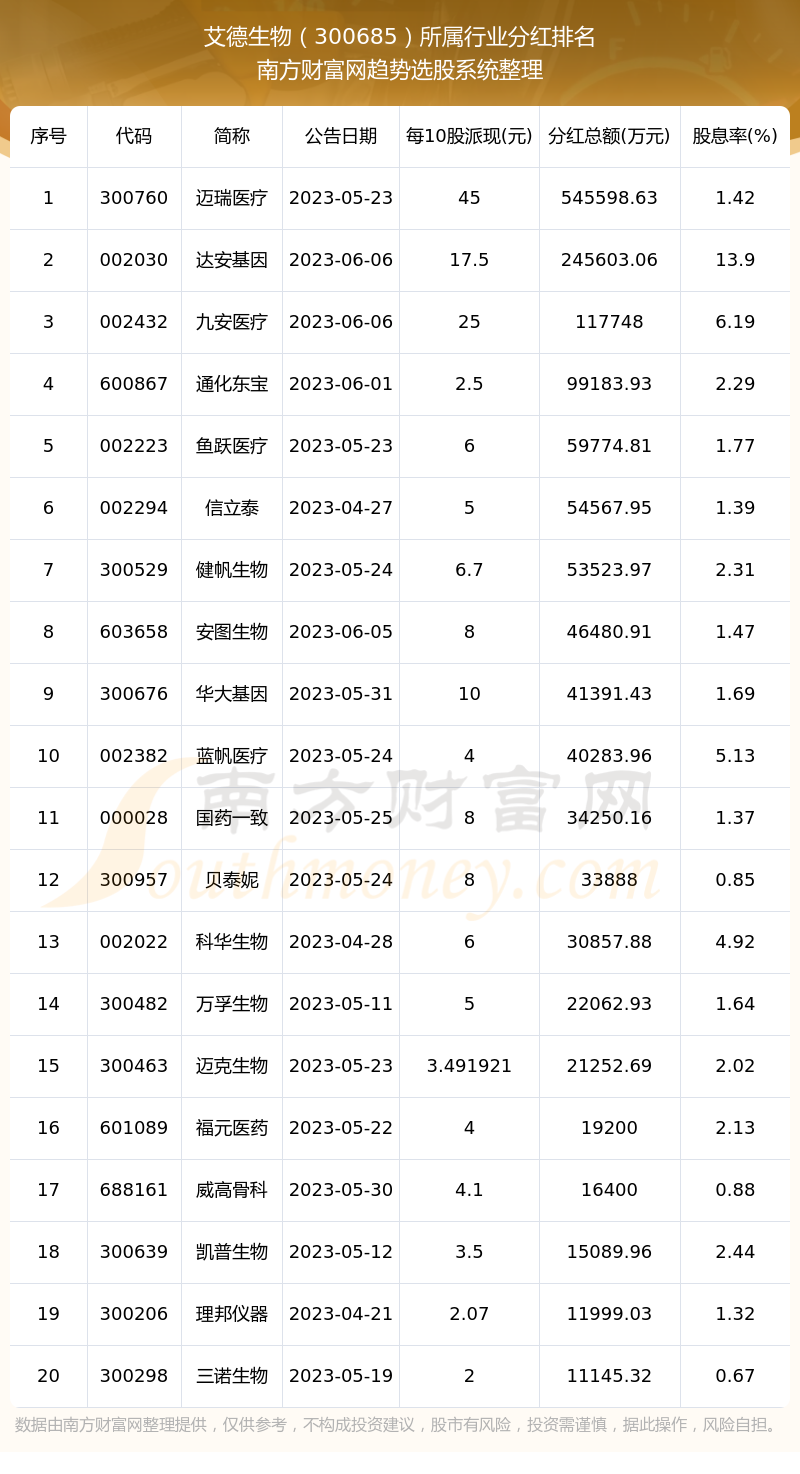 二、艾德生物300685行业分红排名