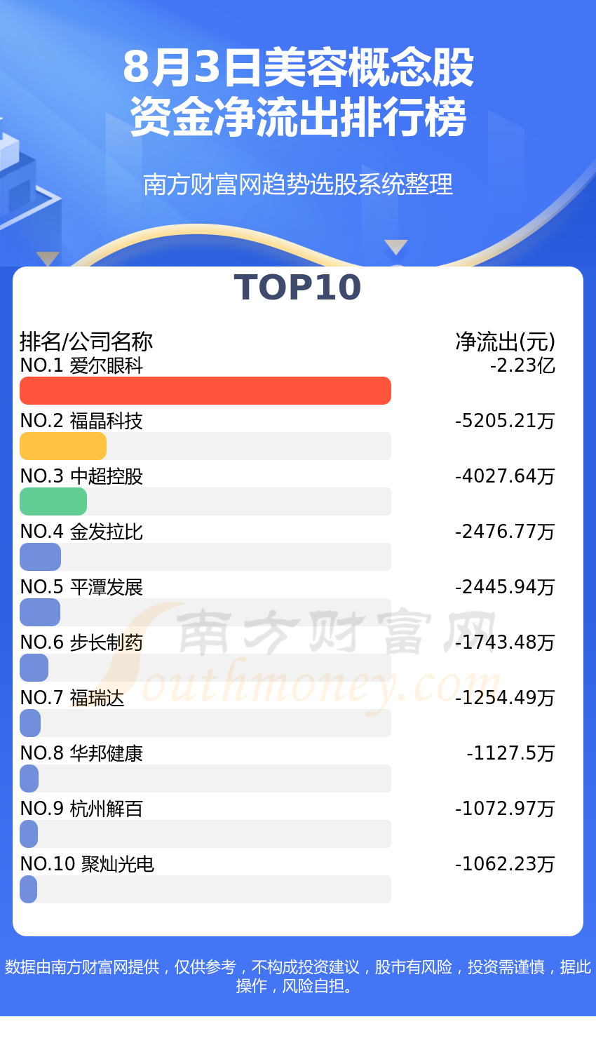 美容概念股8月3日资金净流出情况来看,爱尔眼科位列第一位,主力净流出达到-2.23亿元;福晶科技排名第二,主力净流出为-5205.21万元;中超控股排名第三,主力净流出-4027.64万元。主力净流出排名前10的还有:金发拉比、平潭发展、步长制药、福瑞达、华邦健康、杭州解百、聚灿光电。