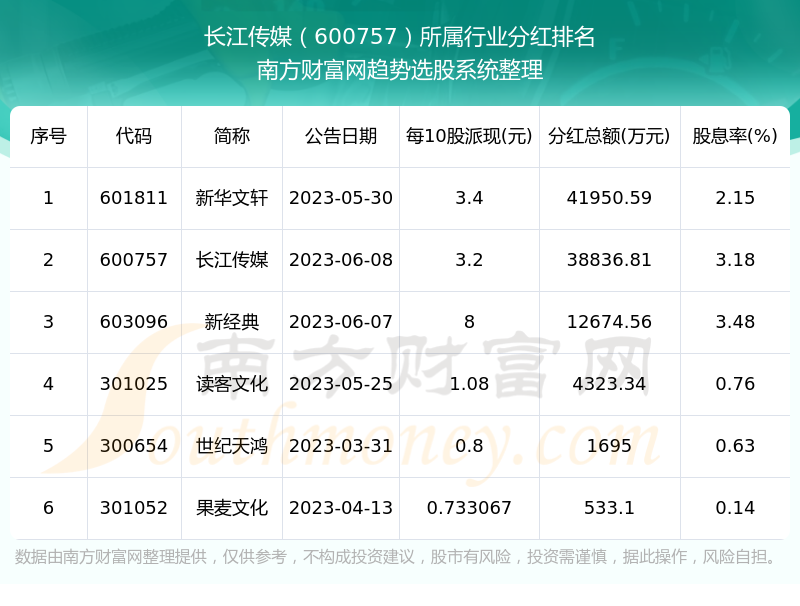 按照趋势选股系统统计,长江传媒所属行业为图书行业,图书行业分红排名情况如下表: