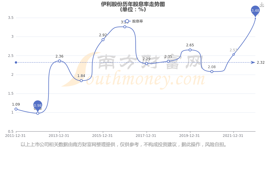 伊利股份最新一次公布的分红方案为10派10.4元。本次权益分派股权登记日为2023年6月12日,除权除息日为2023年6月13日,派息日为2023年6月13日。