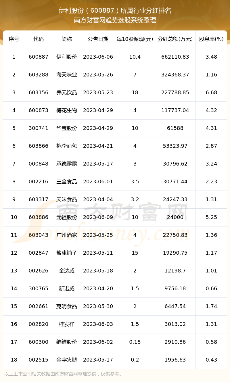 按照趋势选股系统统计,伊利股份所属行业为食品饮料行业,食品饮料行业分红排名情况如下表: