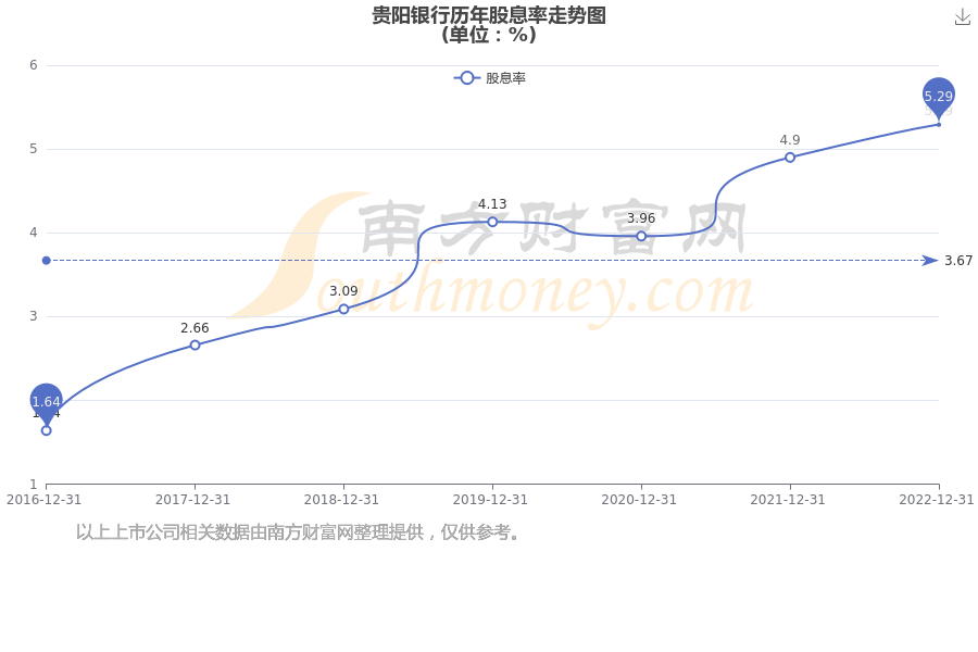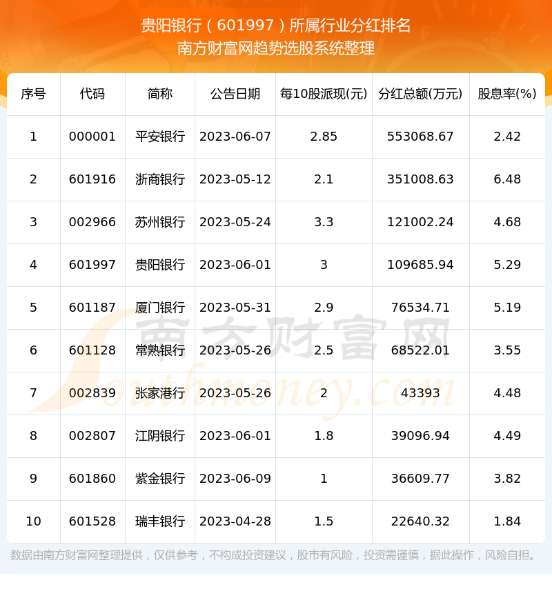 按照趋势选股系统统计,贵阳银行所属行业为银行行业,银行行业分红排名情况如下表: