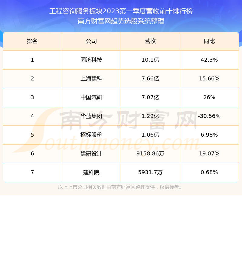 按照趋势选股系统统计,该股所属板块为工程咨询服务板块,该板块共有7只股票,中公高科2023第一季度营收在该板块中排名为第7名,该板块2023第一季度营收排名前十的股票如下表: