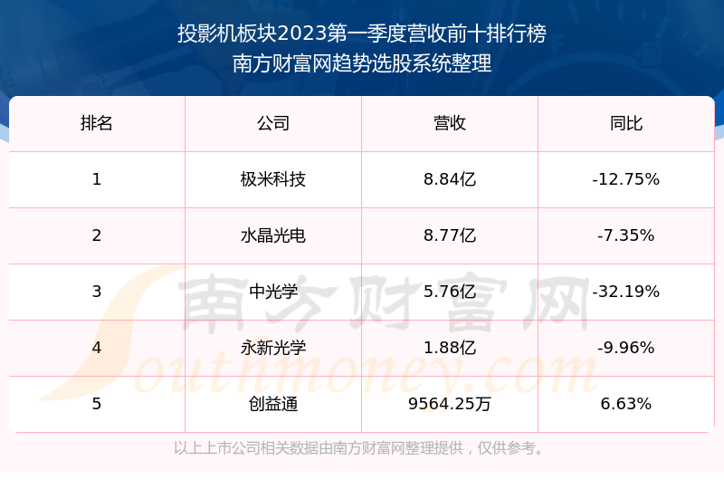 按照趋势选股系统统计,该股所属板块为投影机板块,该板块共有5只股票,光峰科技2023第一季度营收在该板块中排名为第5名,该板块2023第一季度营收排名前十的股票如下表: