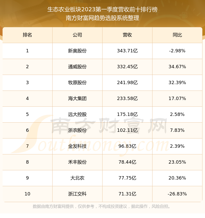 按照趋势选股系统统计,该股所属板块为生态农业板块,该板块共有75只股票,福成股份2023第一季度营收在该板块中排名为第75名,该板块2023第一季度营收排名前十的股票如下表: