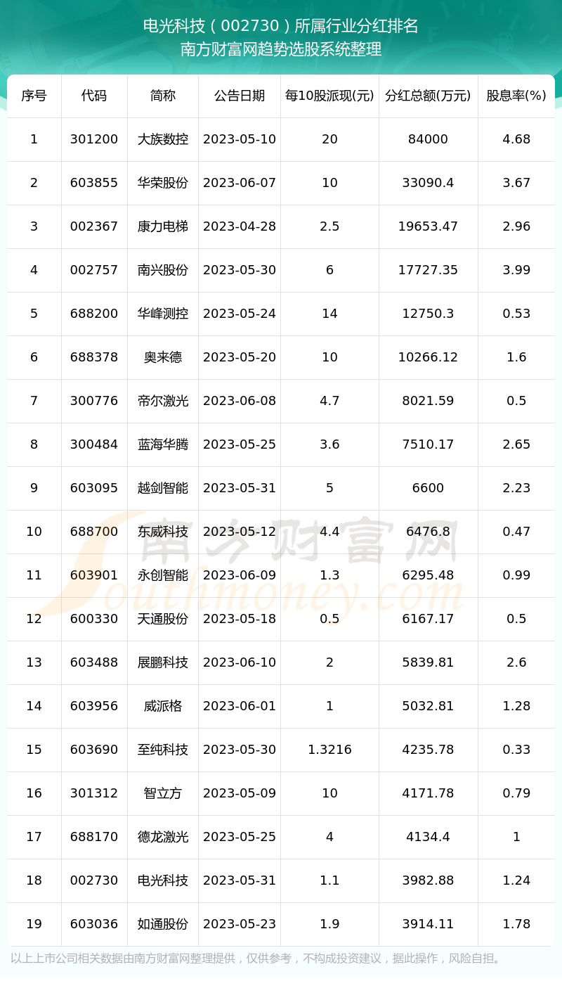 按照趋势选股系统统计,电光科技所属行业为专用设备行业,专用设备行业分红排名情况如下表: