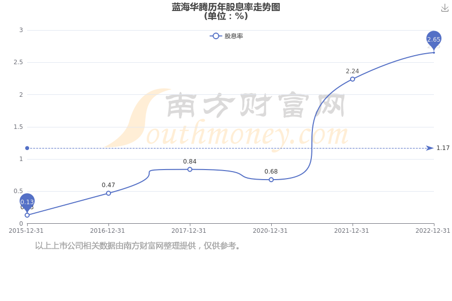 近年蓝海华腾年度股息率走势如下图: