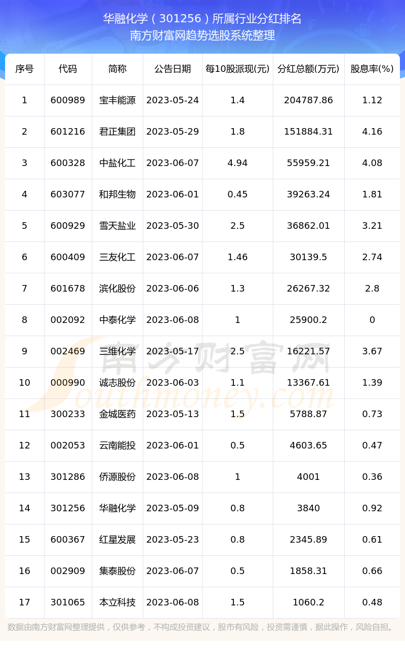 二、华融化学301256行业分红排名