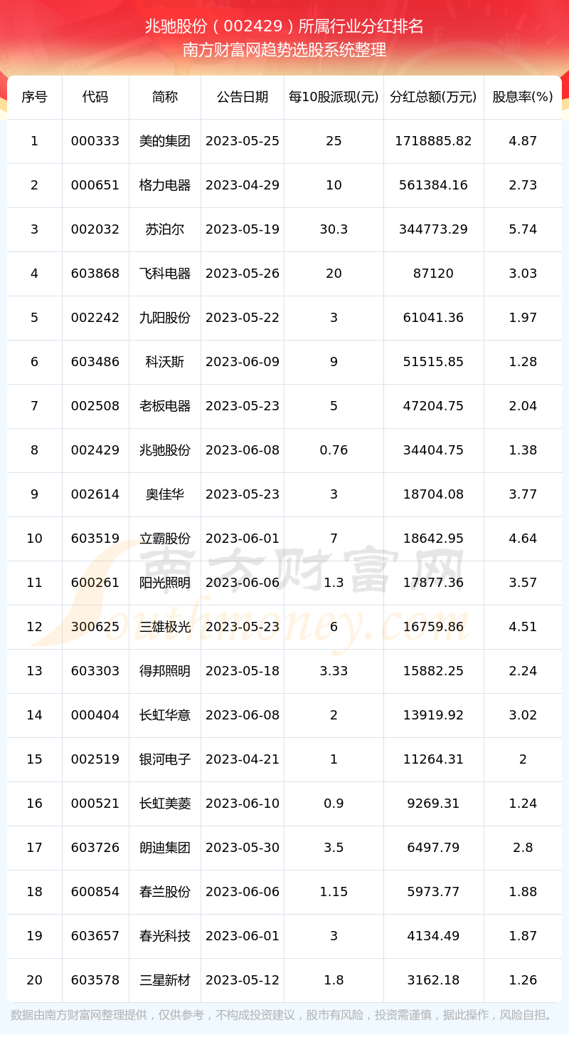 二、兆驰股份002429行业分红排名