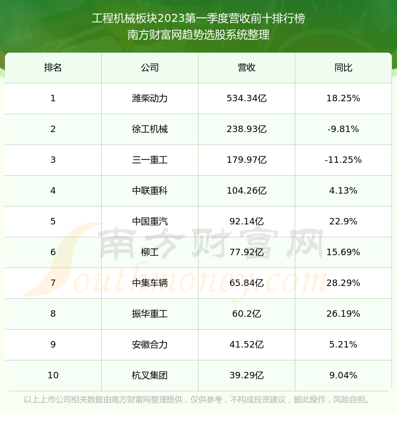 按照趋势选股系统统计,该股所属板块为工程机械板块,该板块共有55只股票,建设机械2023第一季度营收在该板块中排名为第28名,该板块2023第一季度营收排名前十的股票如下表: