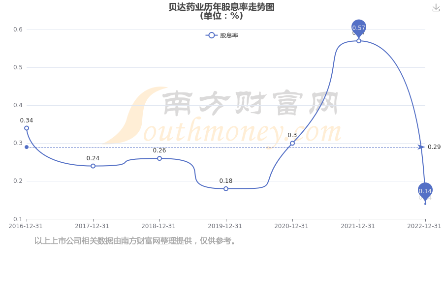 贝达药业最新一次公布的分红方案为10派0.7元。本次权益分派股权登记日为2023年6月14日,除权除息日为2023年6月15日,派息日为2023年6月15日。