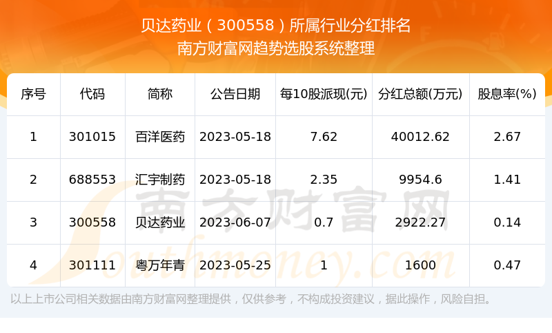 按照趋势选股系统统计,贝达药业所属行业为药品销售行业,药品销售行业分红排名情况如下表: