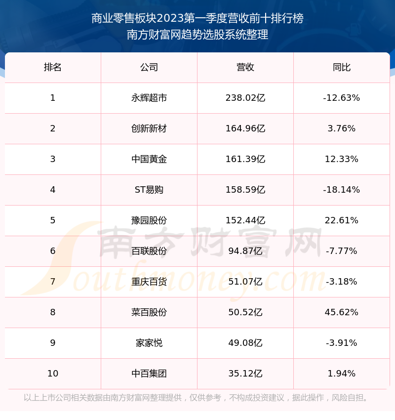 按照趋势选股系统统计,该股所属板块为商业零售板块,该板块共有66只股票,北京人力2023第一季度营收在该板块中排名为第59名,该板块2023第一季度营收排名前十的股票如下表: