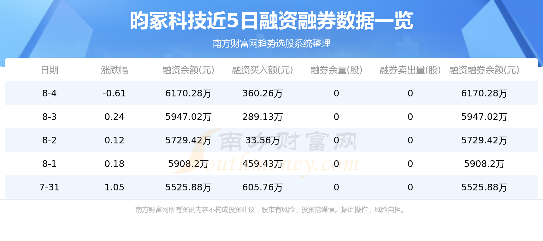 昀冢科技8月4日融券信息显示,融资方面,当日融资买入360.26万元,融资偿还137.01万元,融资净买额223.26万元。近5日融资融券数据一览见下表: