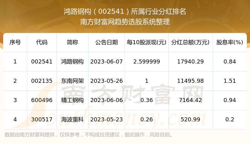 按照趋势选股系统统计,鸿路钢构所属行业为钢结构行业,钢结构行业分红排名情况如下表: