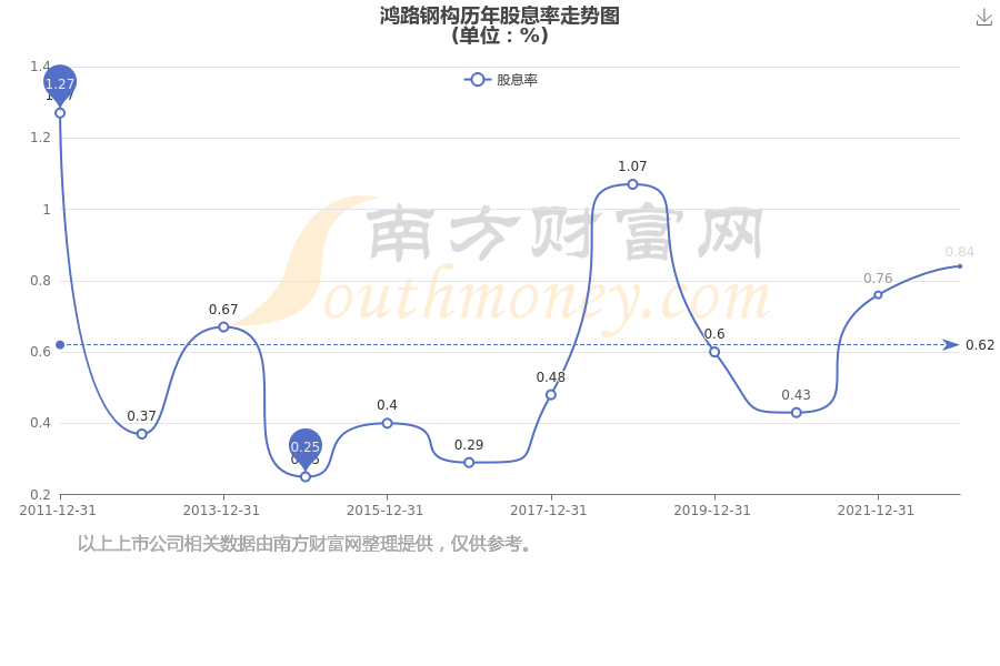 鸿路钢构最新一次公布的分红方案为10派2.599999元。本次权益分派股权登记日为2023年6月13日,除权除息日为2023年6月14日,派息日为2023年6月14日。