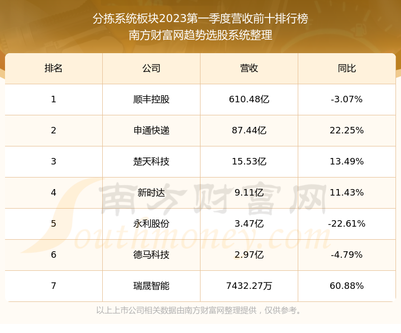 按照趋势选股系统统计,该股所属板块为分拣系统板块,该板块共有7只股票,中科微至2023第一季度营收在该板块中排名为第7名,该板块2023第一季度营收排名前十的股票如下表: